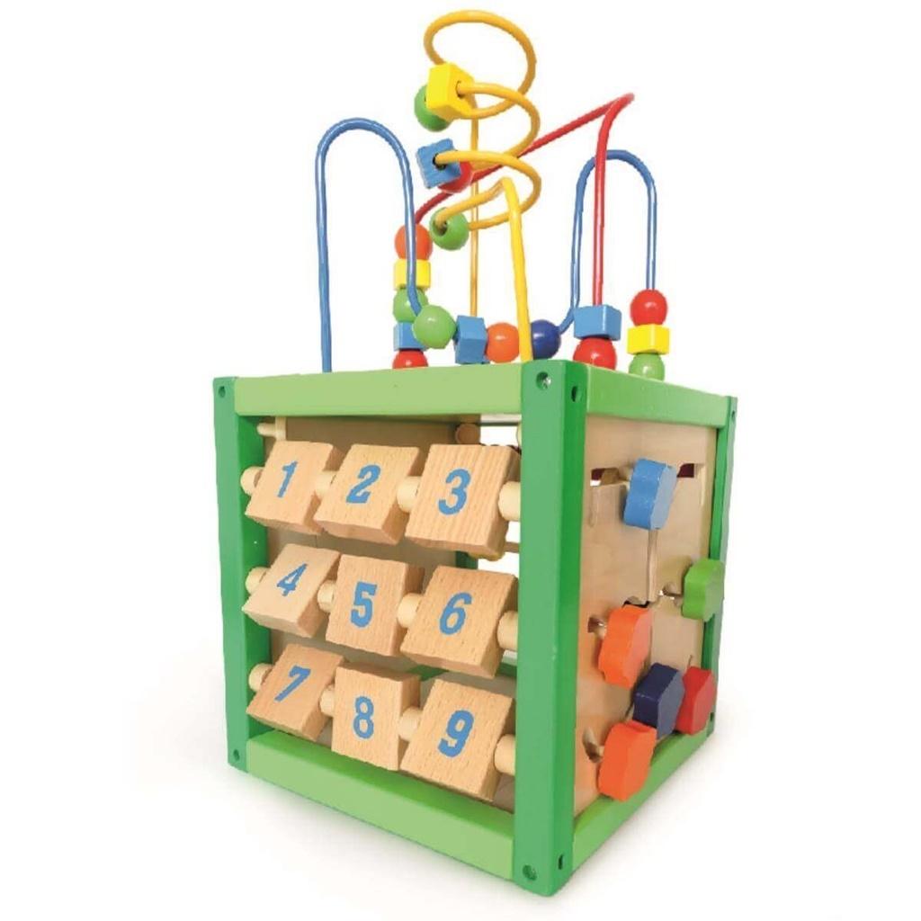 - Pudełka w którym każda ze ścian kryje nową, wciągającą zabawkę: labirynt, liczydło, tablicę, obrotowe klocki z cyferkami i rysunkami zwierząt
