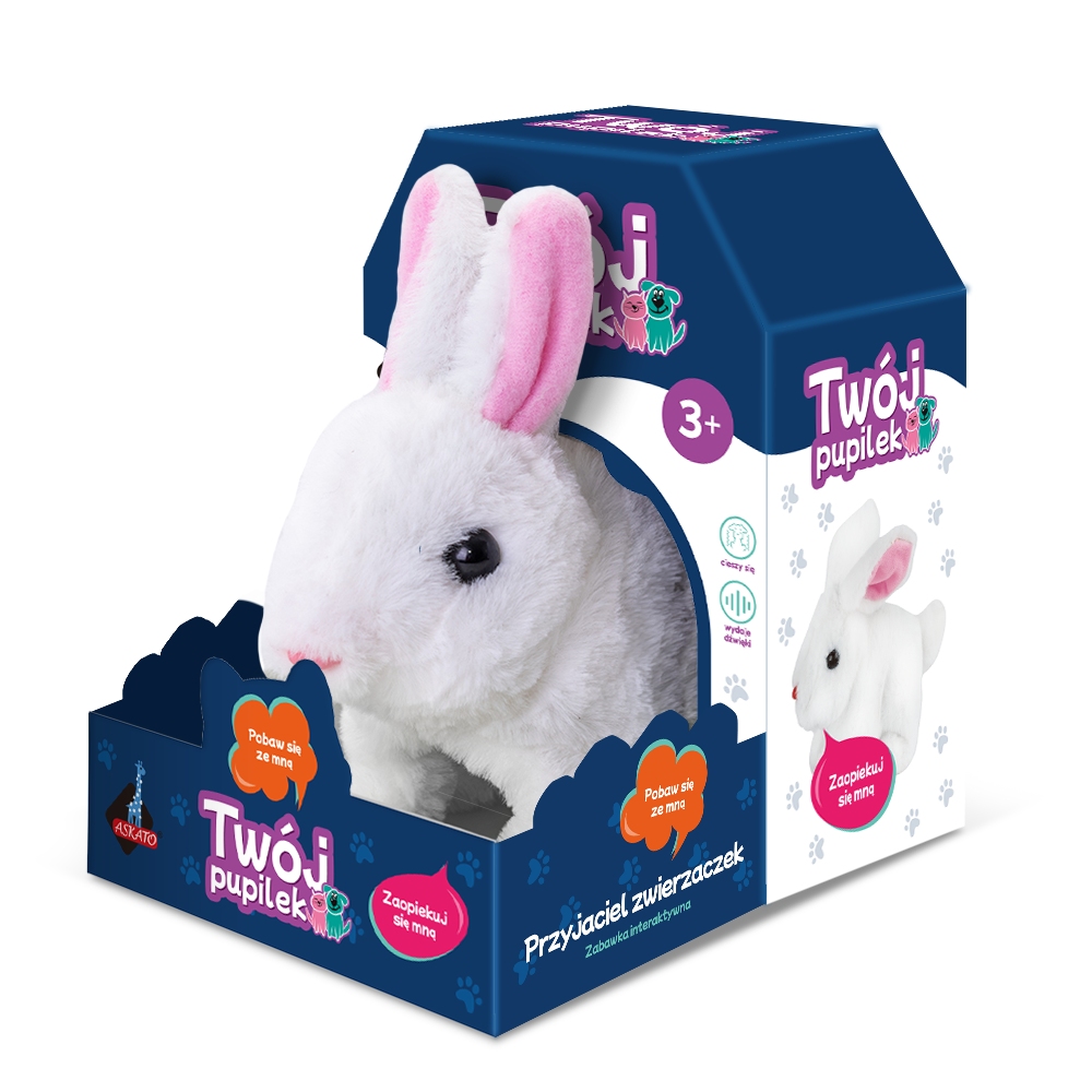 Zajączek radośnie kica, rusza pyszczkiem oraz uszami i ogonkiem, niczym prawdziwy zając.
