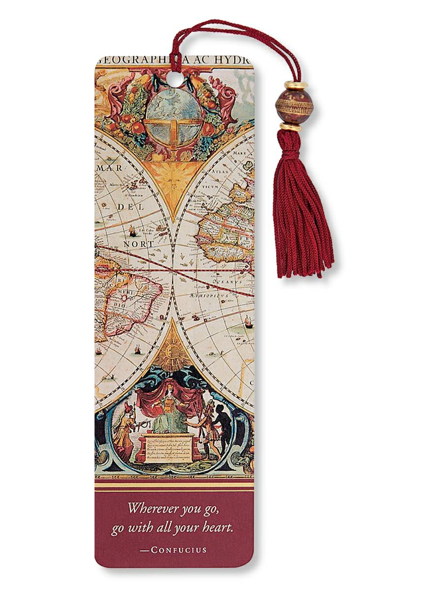 Zakładka do książki firmy Peter Pauper Press - Stary Świat (Old World). Cytat ``Wherever you go, go with all your heart.`` (Gdziekolwiek jesteś, idź z całego serca) należy do Konfucjusza Zakładka ma dopasowaną kolorystycznie wstążkę z frędzlem oraz koralik. Barwne, trwałe, zabawne lub motywujące nadruki sprawią, że czytanie będzie jeszcze ciekawsze. Każda zakładka jest drukowana na trwałym, powlekanym kartonie i pakowana w przezroczystą osłonkę. Uniwersalny wymiar 6,4 x 18,1 cm.