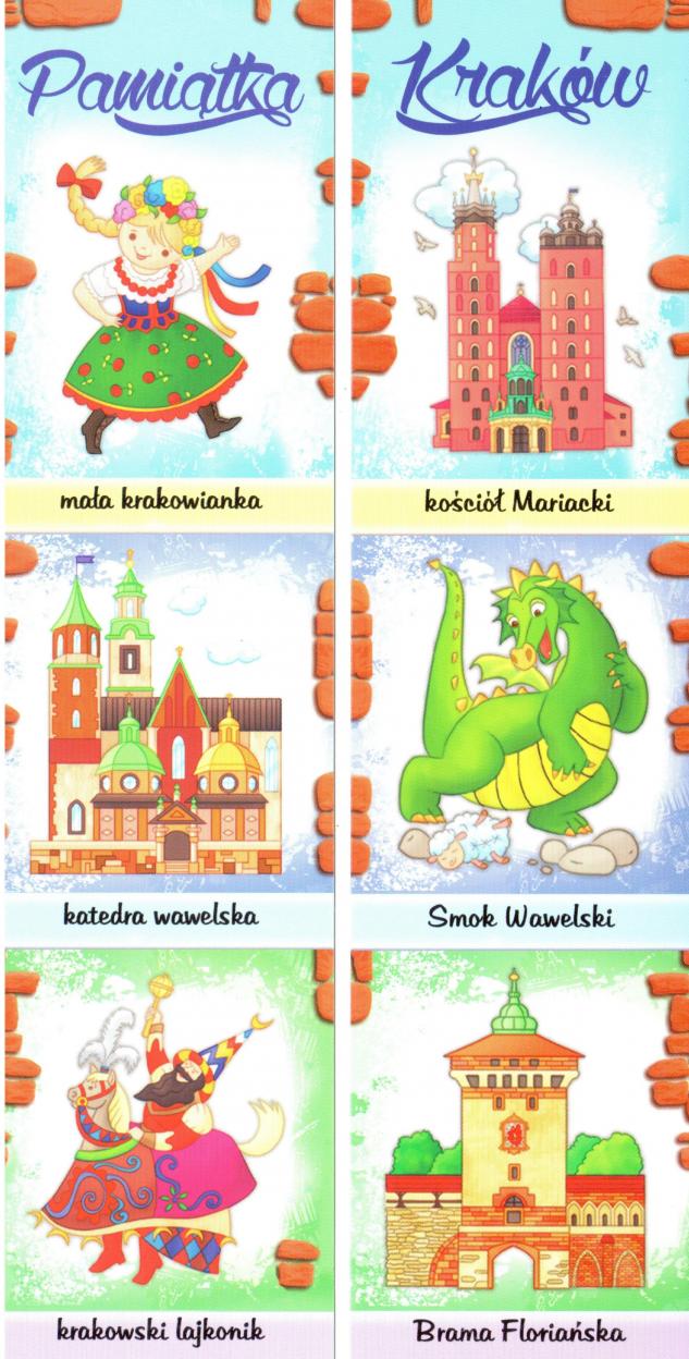 Zakładka. ""Pamiątka z Krakowa - dzięcięca "" jest to produkt posiadający atrakcyjne dla dzieci obrazki związane z Krakowem.
