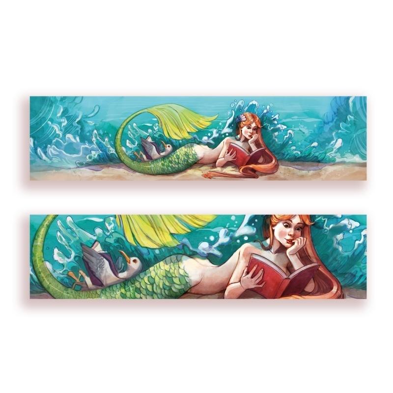 Zanurz się w magii opowieści razem z uroczą syrenką, która odkrywa fascynujący świat książek na morskiej plaży. Idealna zakładka dla miłośników przygód i literatury Karton ozdobny perłowy 300g, sztywny, metaliczno-srebrny połysk Wymiary: 50x200mm