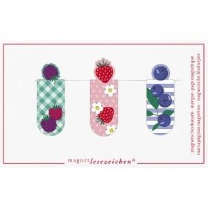 Zakładki Magnetyczne - Jagody 2. Pięknie ilustrowane zakładki z wystającymi, ozdobnymi elementami. Idealne do zaznaczania ostatnio czytanych lub ulubionych fragmentów książek. Doskonale sprawdzają się w indeksowaniu notatek, dokumentów w biurze, w szkole i w domu. Każdy zestaw zawiera 3 zakładki o różnych wzorach, skoordynowanych tematycznie.