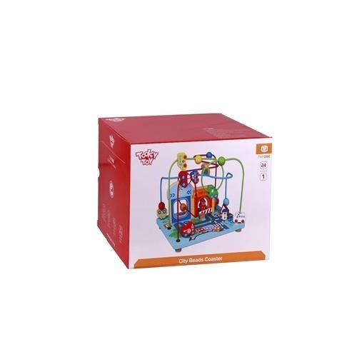 Zakręcone Miasto to drewniana zabawka z labiryntami po których przesuwamy barwne koraliki i figurki pojazdów.