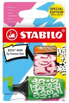 STABILO BOSS MINI by Snooze One to nowa, limitowana edycja popularnego zakreślacza mini w neonowych kolorach. Tym razem jednak do radosnych barw: żółtej, zielonej, pomarańczowej, różowej i niebieskiej dołączył czarny marker w mini formacie, który umożliwia rysowanie wyraźnego konturu oraz tworzenie efektu trójwymiarowego. Tworzenie kolorowych napisów będzie teraz prawdziwą radością! Kartonowe etui zawierające 3 szt. zakreślaczy w kolorach: zielony, pomarańczowy, różowy.
