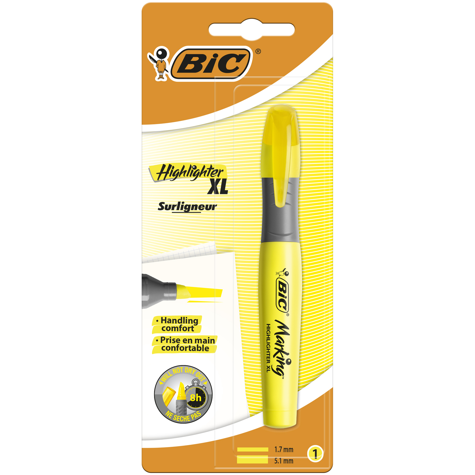 Ergonomiczny kształt i żłobiony uchwyt zapewniające komfort i kontrolę. Długo piszący zakreślacz dzięki dużemu zbiornikowi tuszu. Jasny, fluorescencyjny tusz nadający się do papieru, faxu i fotokopii.