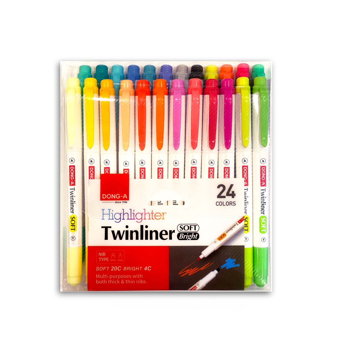 Dwustronny zakreślacz wodoodporny, nieblaknący tuszem.Dwa rodzaje końcówek: ścięta 4 mm i okrągła 0,9 mm. Komplet 24 sztuk zawiera 19 zakreślaczy w kolorach pastelowych, 4 fluorescencyjne i kolor czarny.