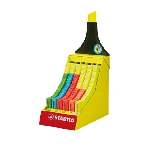 Nr 1 na świecie! Zakreślacz fluorescencyjny z tuszem na bazie wody, do pisania na wszystkich rodzajach papieru (również faksowym i samokopiującym). Duża odporność na wysychanie. Dostępny w 9 kolorach, szerokość linii od 2 do 5 mm. Tekturowy display w kształcie zjeżdżalni o wymiarach: 180x420x270 mm. Zawartość 120 szt. w 6 kolorach: 10 szt.: 40, 54; po 16 szt.: 31, 33, 56; 52 szt. 24.