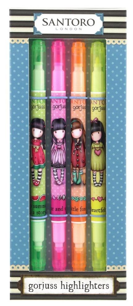 Zakreślacze - Gorjuss - Zestaw. Zestaw czterech zakreślaczy w pudełku w kolorach różowym, pomarańczowym, żółtym i zielonym. Każdy ozdobiony wizerunkiem dziewczynki Gorjuss. Przydatne w szkole, biurze i podróży. Do tworzenia pięknych, kolorowych ""zakreślanek""