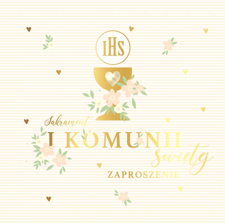 Zaproszenie na Komunię Passion Moments Kukartka PMZ-119 Zaproszenia z serii Passion Moments PMZ to idealne połączenie stylu i przystępnej ceny. Zaproszenia PMZ drukowane są na satynowym, śnieżnobiałym papierze, a każde posiada przynajmniej dwa uszlachetnienia: złocenie lub srebrzenie, elementy z perłowej lub holograficznej folii itp. W opakowaniu znajduje się 5 zaproszeń i 5 dopasowanych do nich kopert. Cechy szczególne: typ produktu: zaproszenie opakowanie: woreczek zawierający 5 sztuk zaproszeń z kopertami, zdobienia: przynajmniej dwa: złocenie, srebrzenie, perłowa lub holograficzna folia, brokat, okazja: Komunia