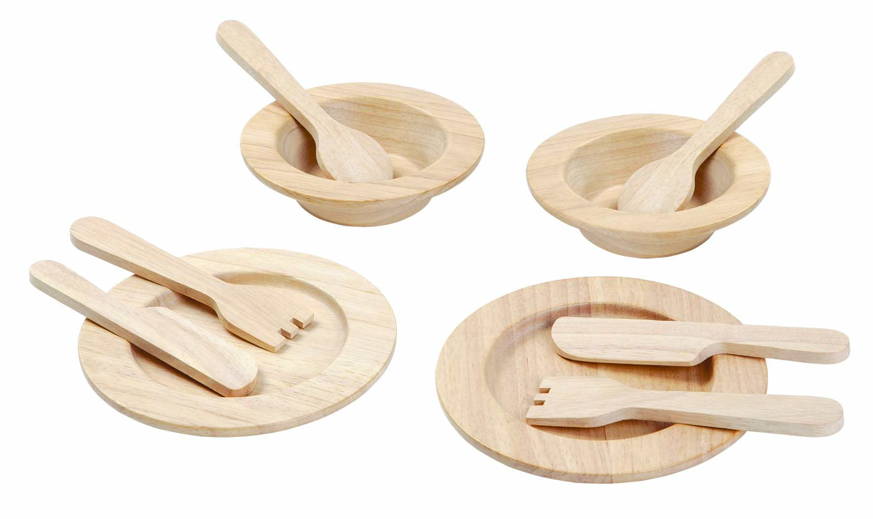 Estetyczna i praktyczna zastawa do serwowania obiadu dla lalek: 2 głębokie i 2 płaskie talerze, 2 noże, 2 łyżki i widelce. Naturalnie z drewna!