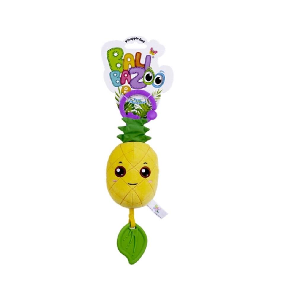 Do rodzinki Pluszaków Luzaków dołączyły owoce i warzywa! Uroczy Ananas wykonany z materiałów o zróżnicowanej fakturze stymuluje zmysł dotyku dziecka. W swym wnętrzu posiada dzwoneczek, za sprawą którego wydaje wesoły dźwięk przy potrząsaniu. Zawieszkę zdobi miękki gryzaczek w kształcie listka. Praktyczny uchwyt umożliwia przymocowanie zabawki w dowolnym miejscu.
