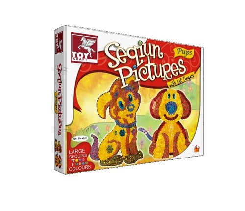 Obrazki zdobione cekinami przeznaczone są dla najmłodszych dzieci od lat 3. Zestaw zawiera dwa szablony obrazków dobranych tematycznie. Początkowo dziecko nie widzi obrazków ponieważ są zakryte samoprzylepnym papierem. Zestaw zawiera duże, różnokolorowe cekiny, które dziecko powinno przykleić we właściwych miejscach dopasowując je kolorystycznie odpowiednio z kolorami pokazanymi na szablonach.