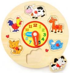Drewniana zabawka - zegar z puzzlowymi zwierzątkami.