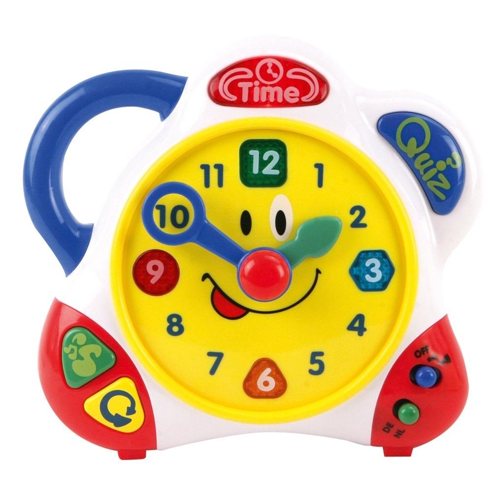 Wesoły dwujęzyczny (angielski/polski) zegar, który poprzez zabawę pomoże Maluszkowi w nauce cyfr, godzin i rozpoznawania kształtów. Kiedy dziecko zacznie przesuwać wskazówi, usłyszy ustawioną przez siebie godzinę. Po przełączeniu na Quiz Maluszek będzie miał za zadanie wskazać odpowiednią godzinę. Dodatkowo wesołe melodie i świecące przyciski zachęcą dziecko do zabawy. Zegar posiada wygodny do przenoszenia uchwyt, dzięki któremu Maluszek może zabrać go ze sobą wszędzie.