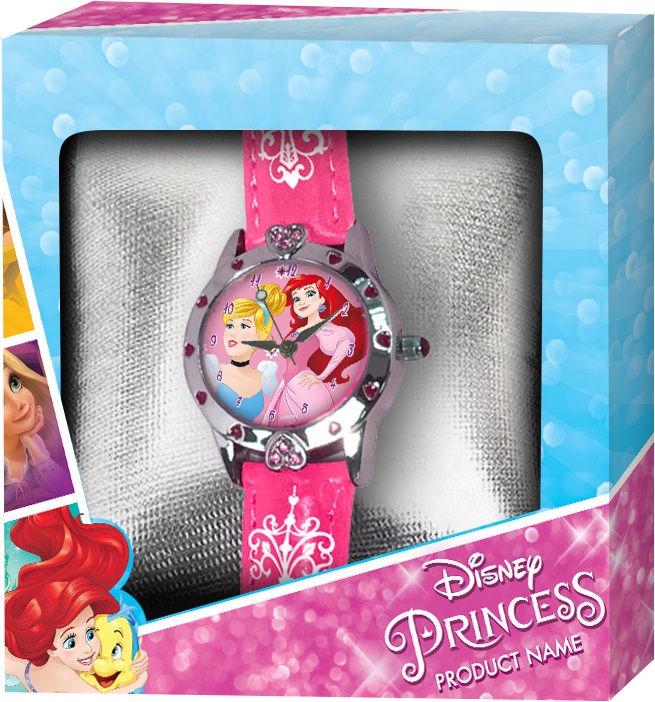 Księżniczki Disneya, Zegarek Analogowy. Oryginalny zegarek analogowy ozdobionym grafiką z bajek Disneya. Zegarek zasilany pojedynczą baterią /zawartą w zestawie/. Pasek posiada klasyczne zapięcie oraz wiele dziurek na każdą rękę. Efektownie zapakowany, idealny prezent. Wymiary: średnica tarczy: 3 cm.
