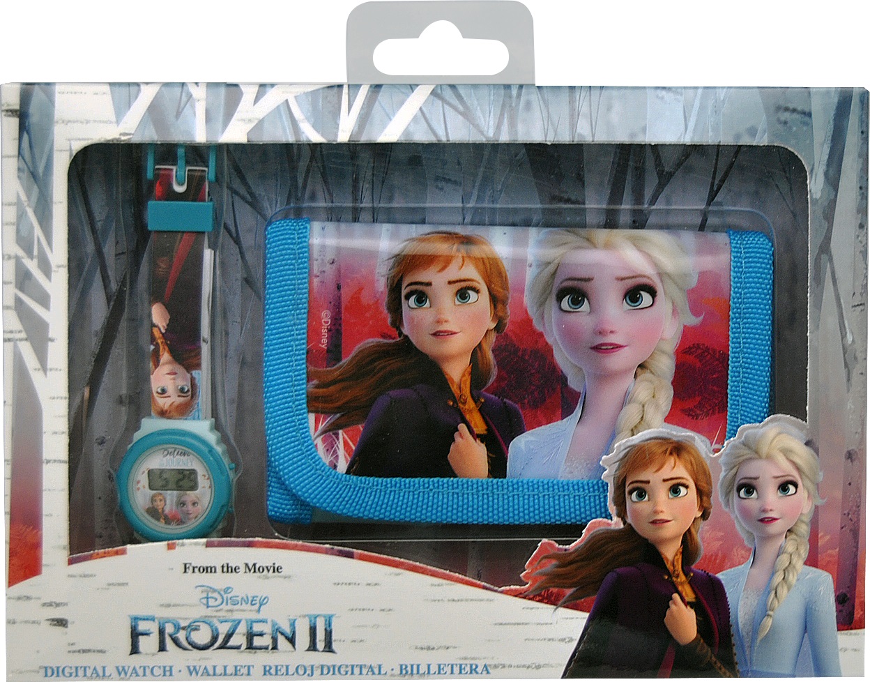 Kraina Lodu 2, Zegarek Elektroniczny I Portfel. Zegarek elektroniczny z portfelem z wizerunkami sióstr Elsy i Anny. Zegarek posiada tarczę elektroniczną zasilany pojedynczą baterią. Zestaw składa się z cyfrowego zegarka na pasku ozdobionym wzorem z kultowej bajki ""Kraina Lodu 2"". Pasek posiada klasyczne zapięcie oraz wiele dziurek na każdą rękę. W zestawie ponadto piękny portfel o rozmiarze 12,5 cm x 8 cm x 1,5 cm. Zestaw idealny na prezent. Wymiary: średnica tarczy - 3 cm.