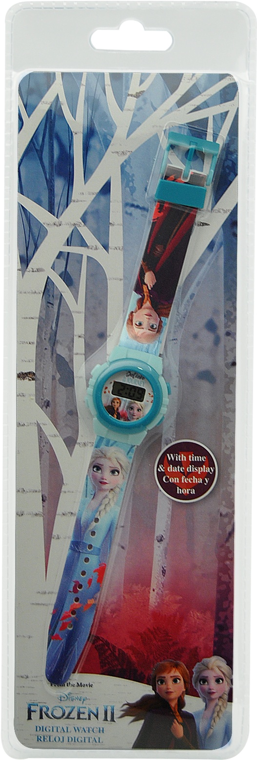 Kraina Lodu 2, Zegarek Elektroniczny. Zegarek elektroniczny ozdobionym grafiką z kultowej bajki ""Kraina Lodu 2"". Zegarek posiada tarczę elektroniczną, zasilany pojedynczą baterią /zawartą w zestawie/. Pasek posiada klasyczne zapięcie oraz wiele dziurek na każdą rękę. Idealny prezent. Wymiary: średnica tarczy - 3 cm.