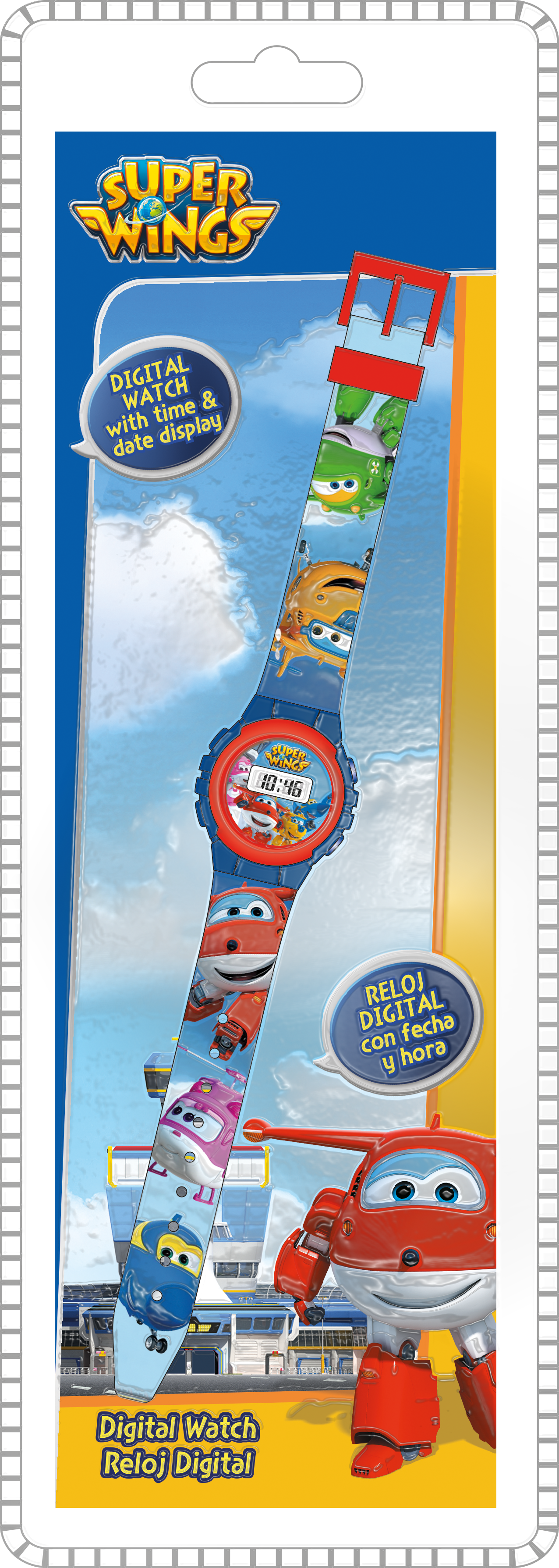 Super Wings, Zegarek Elektroniczny. Oryginalny zegarek elektroniczny ozdobionym grafiką z bajki ""Super Wings"". Zegarek posiada tarczę elektroniczną, zasilany pojedynczą baterią /zawartą w zestawie/. Pasek posiada klasyczne zapięcie oraz wiele dziurek na każdą rękę. Idealny prezent. Wymiary: średnica tarczy: 3 cm.