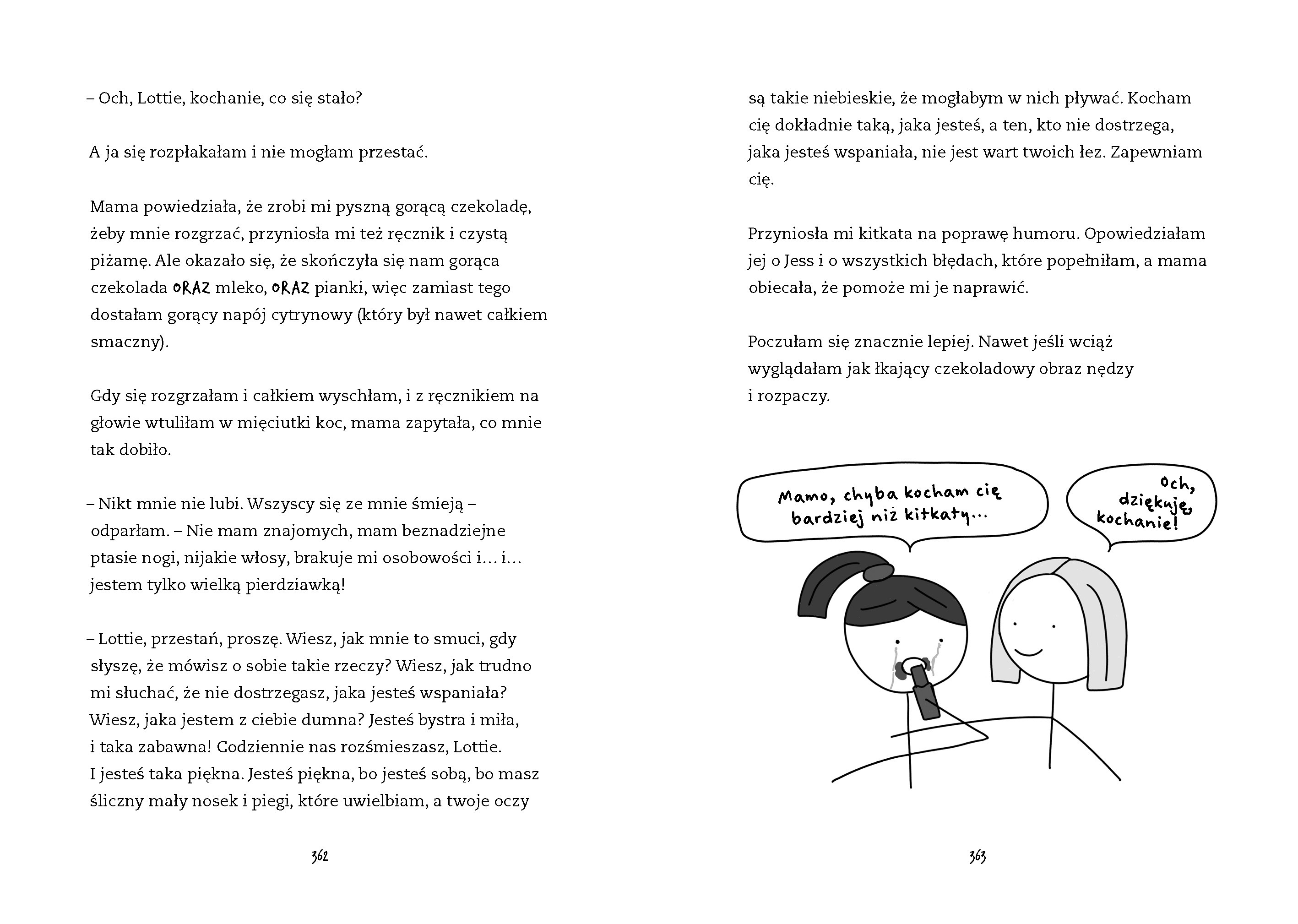 Czy trzeba dodawać, że co drugi dzień jest NAJGORSZYM DNIEM jej życia, a włosy nie układają się w czarujące fale? Wprawdzie mama uważa, że Lottie jest śliczna, ale co ona tam wie! Mówiłaby tak, nawet gdyby jej córka wyglądała jak ziemniak. A przecież większość ludzi nie chce przyjaźnić się z ziemniakami!