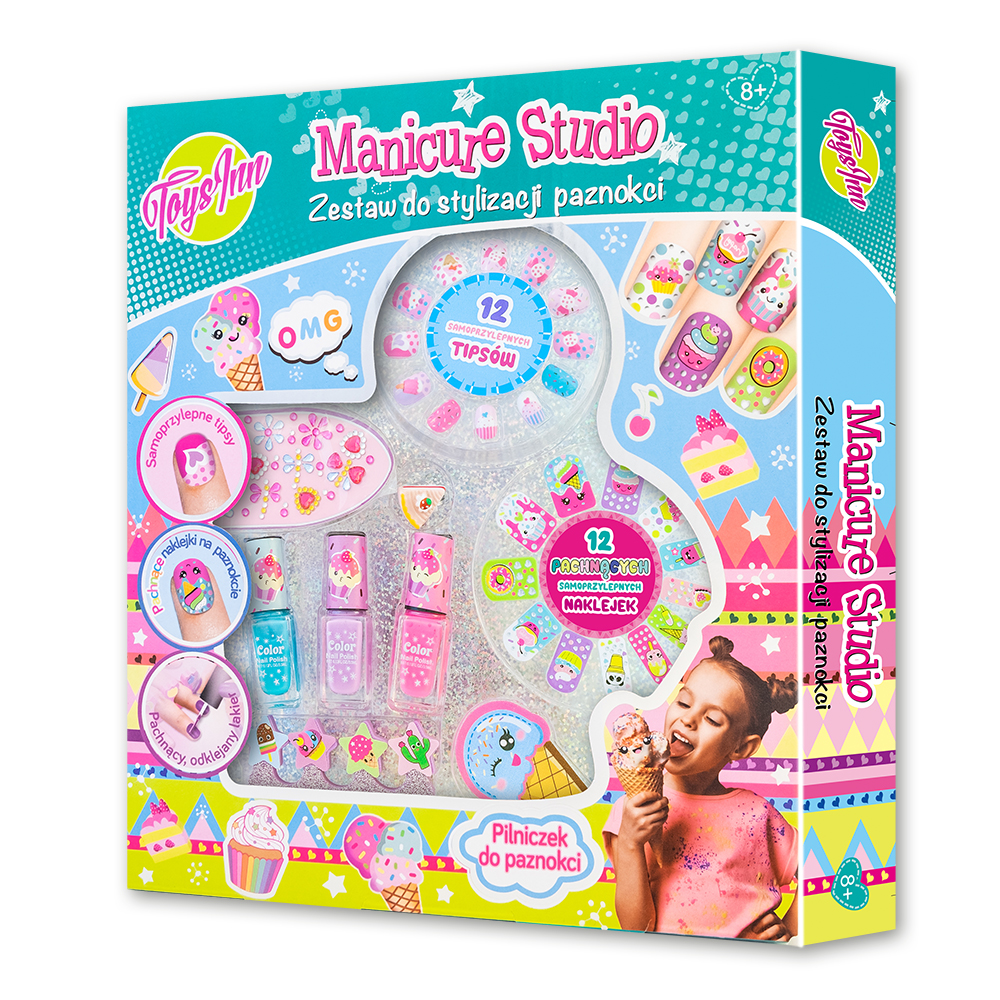 Zestaw 3 Lakiery Sweet został stworzony dla wszystkich dziewczynek, które chcą być modę i lubią się wyróżniać. Zestaw zawiera: 12 pachnących naklejek, 12 samoprzylepnych tipsów, 3 kolorowe lakiery do paznokci, arkusz naklejanych kryształków, pilniczek, pierścionek, separator. Produkt przeznaczony dla dzieci w wieku 8+.