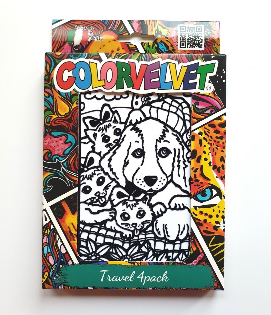 Zestaw 4 małych kolorowanek welwetowych wraz z flamastrami - idealny towarzysz podróży.