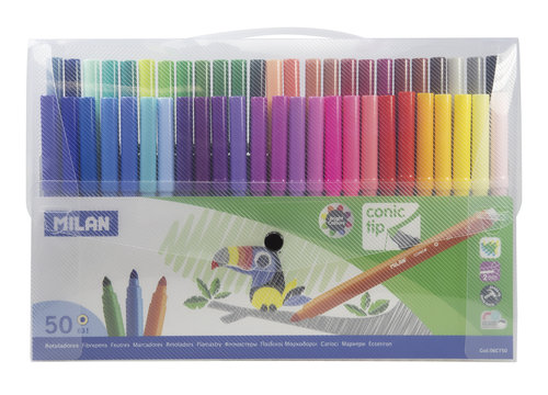 Zestaw 50 flamastrów w plastikowym etui w kształcie walizeczki. Flamastry z wytrzymałą i elastyczną stożkową końcówką o średnicy 5 mm, która nie wpada do środka nawet przy silnym nacisku. Po chwilowym odkształceniu końcówka zawsze wraca do pierwotnego kształtu. Pozwala na rysowanie cienkich i grubych linii (od 3 mm do 0,75 cm). Tusz na bazie wody. Żywe, intensywne kolory. Wentylowana skuwka. Flamastry MILAN są zgodne z europejskimi i amerykańskimi normami bezpieczeństwa. Nie zawierają ftalanów, metali ciężkich i innych substancji toksycznych. Są bezpieczne dla dzieci.