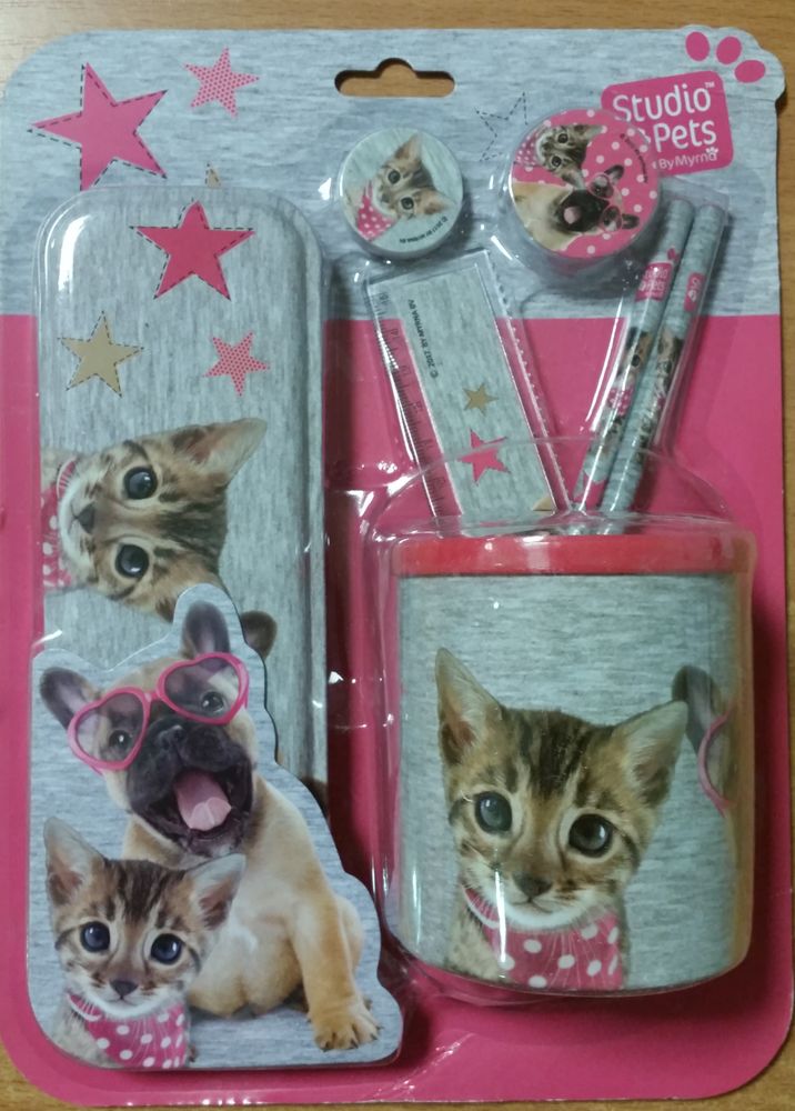 Zestaw szkolno-upominkowy zawiera: piórnik metalowy, pojemnik na kredki, dwa ołówki, linijka 15cm, gumka do mazania, temperówka.