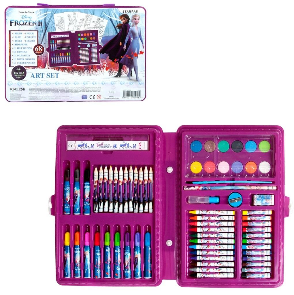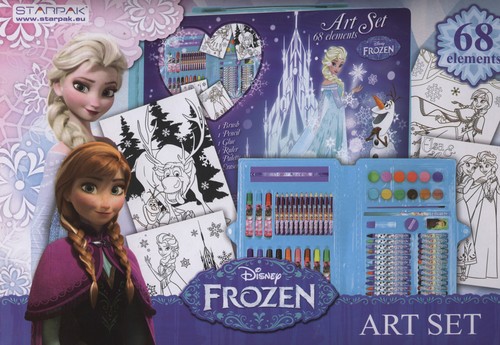 Wspaniały zestaw dla małych artystów pomagający rozwijać im kreatywność i poznawać nowe techniki malarskie. Składa się z 68 elementów: 12 pisaków, 12 kredek woskowych oraz 12 kredek ołówkowych, 12 pasteli, 12 farb akwarelowych, pędzla, temperówki, ołówka, gumki do mazania, kleju, linijki, palety do malowania i 4 kartek ze szkicem do kolorowania. Wszystkie elementy zestawu są wykonane z wysokiej jakości materiałów co zapewni długie użytkowanie. Cały zestaw jest zorganizowany w jednej, zamykanej walizeczce z rączką, ułatwiającej przechowywanie i przenoszenie. Walizka zdobiona jest nadrukiem z bajki Frozen.