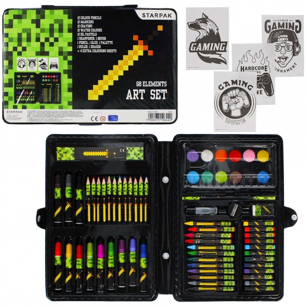 Zestaw przyborów szkolnych z kolekcji Starpak z licencją Pixel games dla małych artystów pomagający rozwijać im kreatywność i poznawać nowe techniki malarskie. Zestaw składa się z 68 elementów: 12 pisaków, 12 kredek woskowych oraz 12 kredek ołówkowych, 12 pasteli, 12 farb akwarelowych, pędzla, temperówki, ołówka, gumki do mazania, kleju, linijki, palety do malowania i 4 kartek ze szkicem do kolorowania. Wszystkie elementy zestawu są wykonane z wysokiej jakości materiałów co zapewni długie użytkowanie. Cały zestaw jest zorganizowany w jednej, zamykanej walizeczce z rączką, ułatwiającej przechowywanie i przenoszenie. Zapoznaj się również z innymi produktami Starpak z serii Pixel games! Produkt przeznaczony dla dzieci w wieku: 3+.