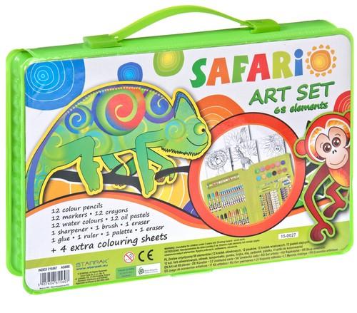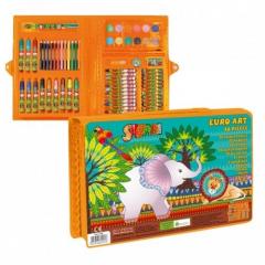 Zestaw artystyczny, złożony z 68 elementów: farb akwarelowych, kredek ołówkowych i świecowych, pisaków, gumki, temperówki, ołówka, kleju i linijki. Pakowane w plastikowej teczce, zamykanej na zatrzask