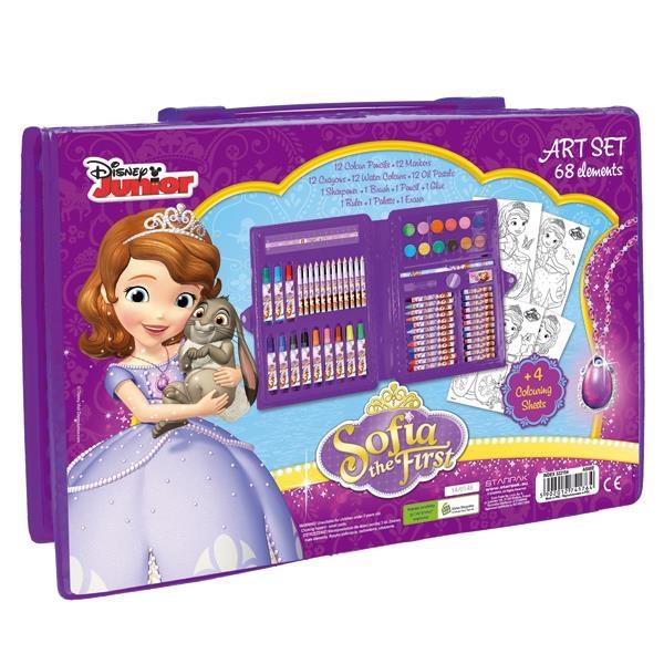 Zestawy artystyczne, złożone z 68 elementów: farb akwarelowych, kredek, pisaków, gumki, temperówki, ołówka, kleju i linijki. Pakowane w plastikowej teczce, zamykanej na zatrzask.