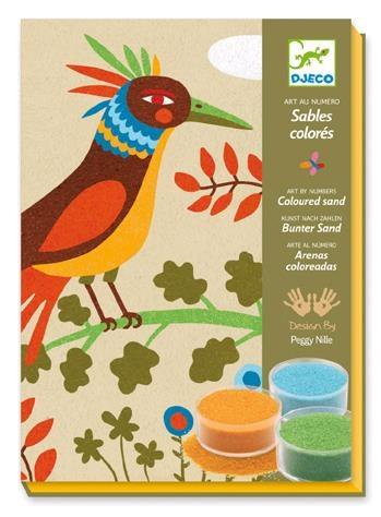 Zestaw do tworzenia artystycznych piaskowych obrazów.Zestaw artystyczny do malowania piaskiem. 4 tablice tekturowe z naszkicowanym rysunkiem. Każdy element jest ponumerowany i pokryty klejem zabezpieczonym taśmą przezroczystą. Dziecko odrywa fragment ""naklejki"" i posypuje kolorowym piaskiem. Piasek przykleja się a jego nadmiar zsypujemy z powrotem do pojemniczka i odklejamy następny kawałek... Do podważania naklejki służy specjalny rysik, dołączony do zestawu. Dzięki pomysłowym rozwiązaniom (piasek sypiemy nad tekturowym pudełkiem z otworkiem na roku) bałagan będzie minimalny, a końcowy efekt zachwycający.Zestaw zawiera: