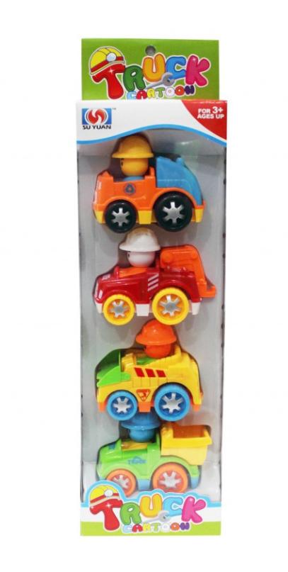 Zestaw kolorowych samochodzików z napędem dla najmłodszych. W zestawie 4 różne wzory autek, m.in. koparka i wywrotka. Pojazdy z napędem frykcyjnym - wystarczy popchnąć je do przodu, a zabawka sama zacznie jechać.