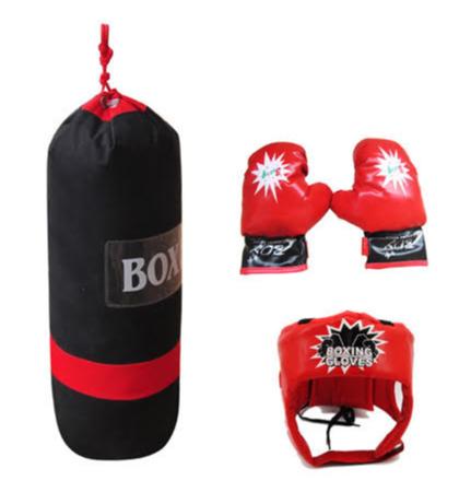 W zestawie worek bokserski (43 cm), ochraniacz na głowę oraz rękawice (19x14 cm). Zapakowane w worek nylonowy.