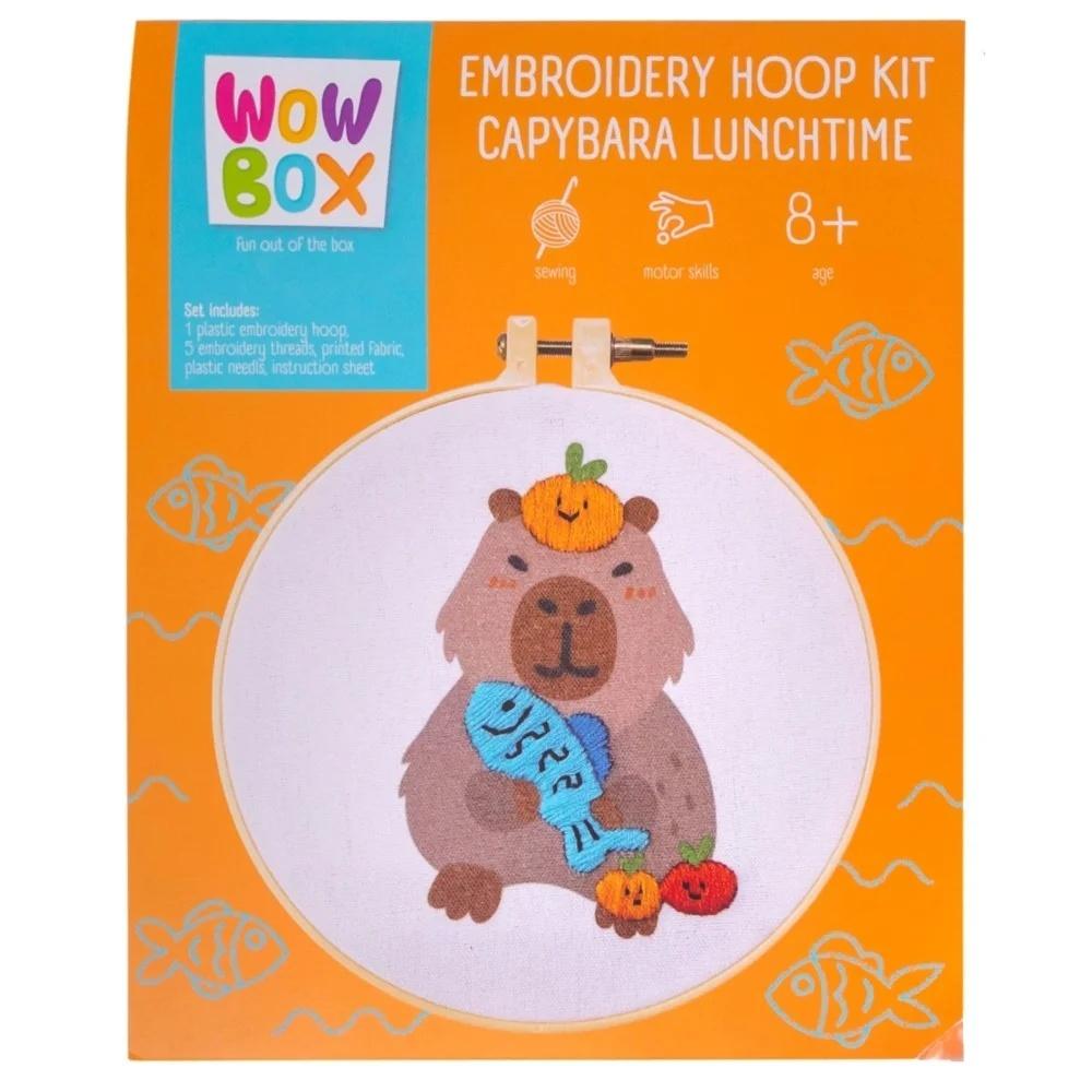 Zestaw do haftu z motywem kapibary podczas lunchu. Zawiera pełen zestaw materiałów i instrukcję. Średnica 14cm Wiek:+8