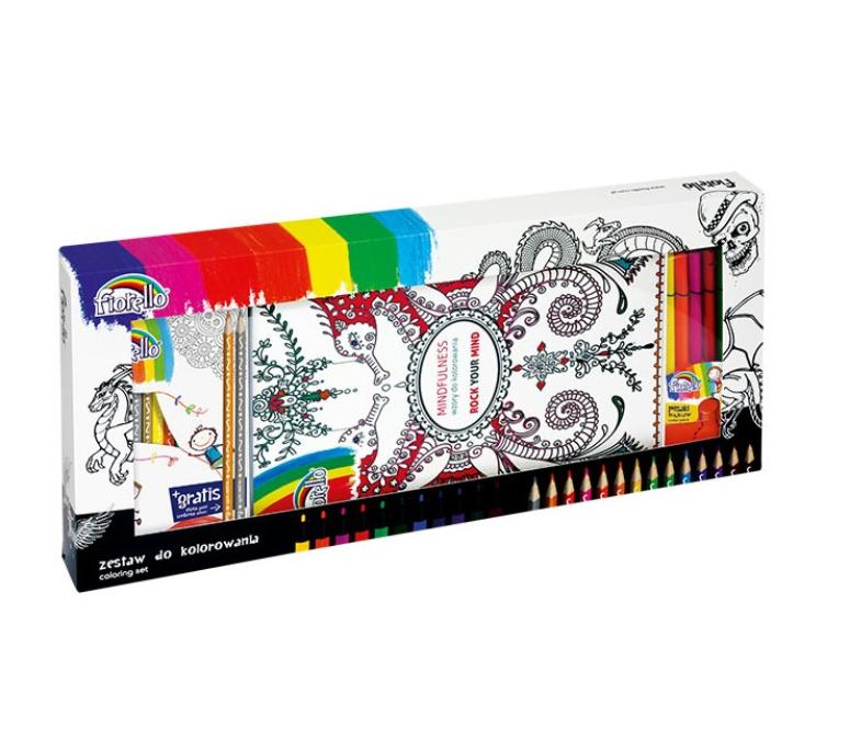 Zestaw zawiera książkę z kolorowankami, kredki ołowkowe 14 kolorów oraz pisaki trójkątne 12 kolorów.