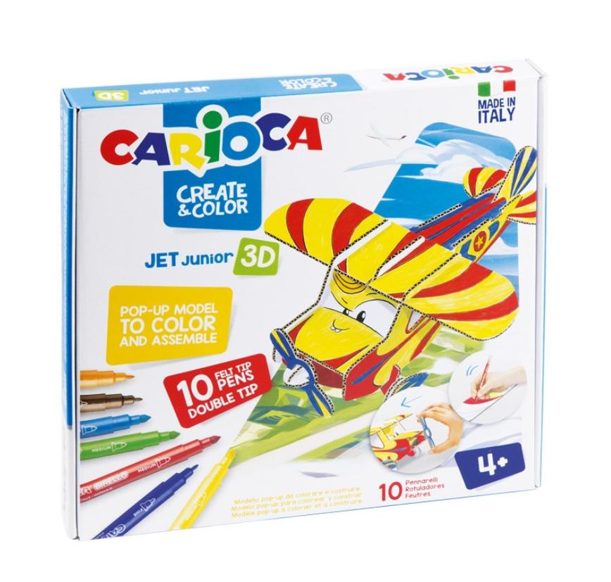 zabawny kartonowy model 3D: koloruj i łącz elementy zestaw zawiera 10 pisaków dwustronnych Carioca Birello i kartonowe elementy do stworzenia modelu samolotu