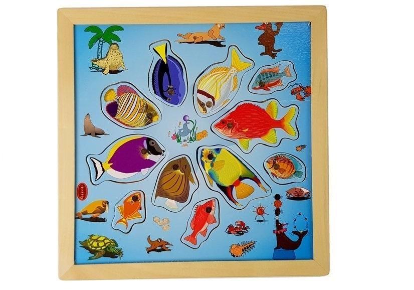 Zestaw do Łowienia Rybek na Magnes Drewniane 27x27 cm Drewniane rybki, kształty do łowienia to zabawka edukacyjna. Puzzle posiadają magnes, dzięki temu za pomocą wędki można je łowić. Dzięki zabawie dziecko rozwija zdolności manuale, ćwiczy koncentracje, precyzyjność i cierpliwości. Zabawka pozwala na grę nie tylko jednej osoby. W zestawie znajduje się podstawa w kształcie kwadratu, 11 rybek i dwie wędki. Zapraszamy Państwa do zakupu wspaniałej magnetycznej gry dla najmłodszych wędkarzy. Teraz dzieci mają możliwość łowienia kolorowych, drewnianych rybek za pomocą jednej z dwóch dołączonych do zestawu wędek. Komplet składa się z puzzli oraz kolorowych obrazków magnetycznych. Elementy zestawu: - plansza do gry - 11 rybek - 2 wędki Wymiary planszy: 27 cm x 27 cm x 1 cm Gra przeznaczona jest dla dzieci powyżej 3. roku życia. Zabawka posiada certyfikat CE i jest zgodna z normą EN 71. Zestaw gry zafoliowany jest folią, dzięki czemu nadają się na prezent dla dziecka