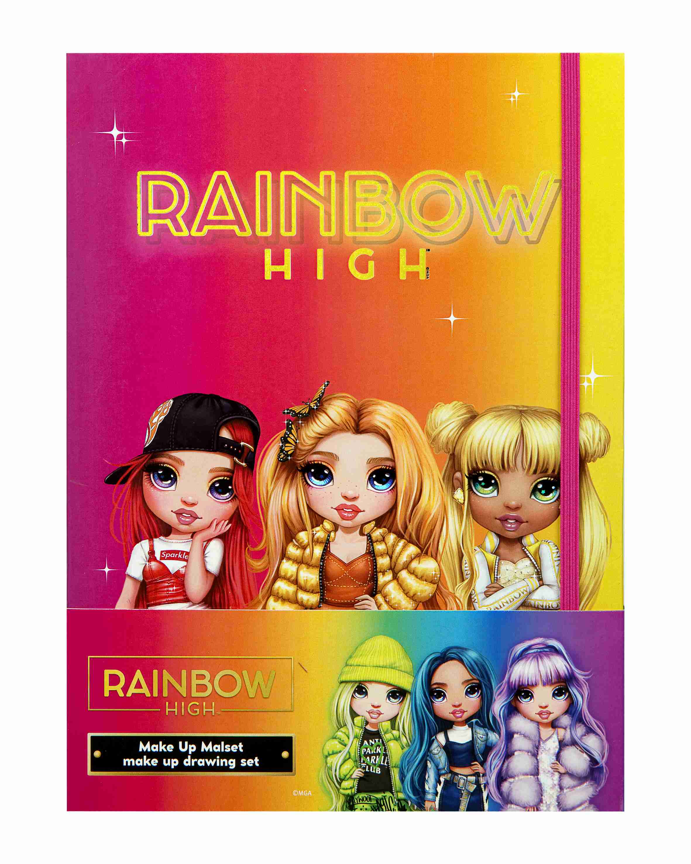 Zestaw plastyczny do kolorowania RAINBOW HIGH zamykany na gumkę. Zawiera: 3 akwarele z pędzelkiem, temperówkę, 2 pudry brokatowe z pędzelkiem do cieni, 10 mini kredek, szkicownik 30 stron.
