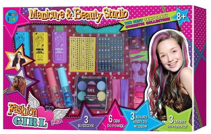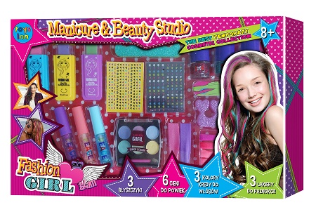 3 lakiery do paznokci, naklejki do paznokci, 3 błyszczyki do ust, kreda do włosów - 3 kolory, cienie do powiek - 6 kolorów, 6 gumek do włosów, 2 pianki do pedicure, 2 tasiemki, pilniczek