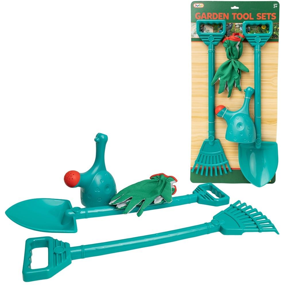 Zestaw do prac ogrodowych - 4 częściowy Łopata, grabie, konewka, rękawiczki wymiary opakowania: 33 x11 x 69 cm