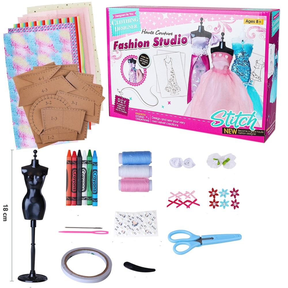 Zestaw do projektowania sukienek W zestawie kawałki materiałów, 3 manekiny, igły, nici, nożyczki, kredki, kokardki, taśma, dżety, wykrojniki Wymiary opakowania: 29x7x20 cm Wiek:+8
