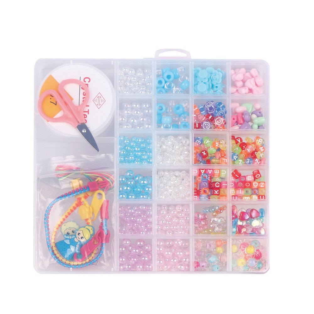 Zestaw zawiera różne koraliki do tworzenia bransoletek (perełki, plastikowe) oraz przywieszki do nich, łączniki, sznureczek. Wymiary opakowania: 20 x 3 x 20 cm