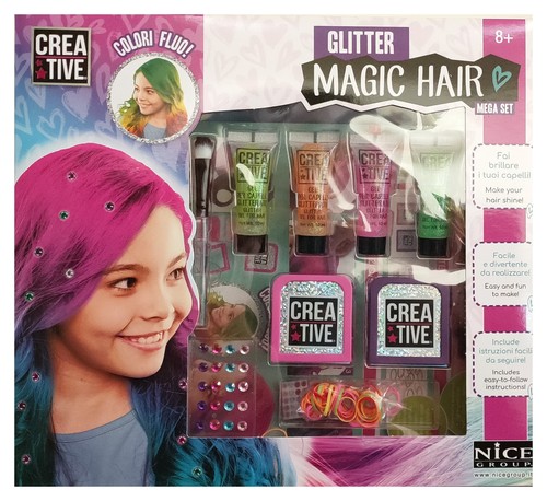 Zestaw do ozdabiania włosów spodoba się każdej małej miłośniczce szalonych dodatków. W zestawie znajdują się barwniki w neonowych kolorach, brokat, kolorowe gumeczki oraz akcesoria do nakładania kosmetyków. Wszystko bezpieczne i przeznaczone do kontaktu ze skórą! Wiek: 8+