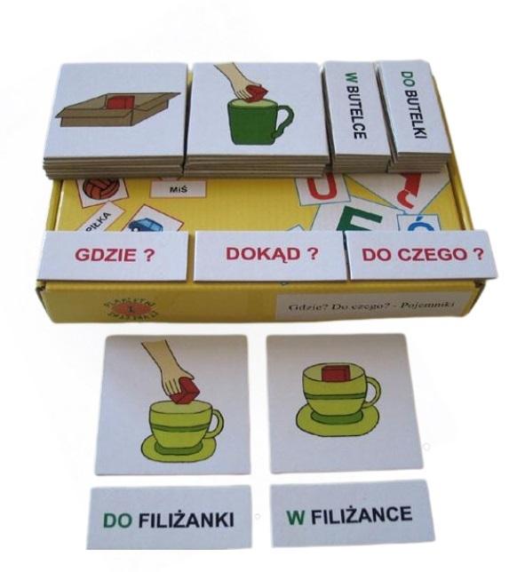 Gdzie?(Dokąd?)Do czego? , oraz udzielaniu odpowiedzi obrazkiem, etykietką lub slowem - pokazywaniu zmiany końcówki rzeczownika w zależności od użytego przyimka, czytania globalnego (całymi wyrazami). Zestaw zawiera: