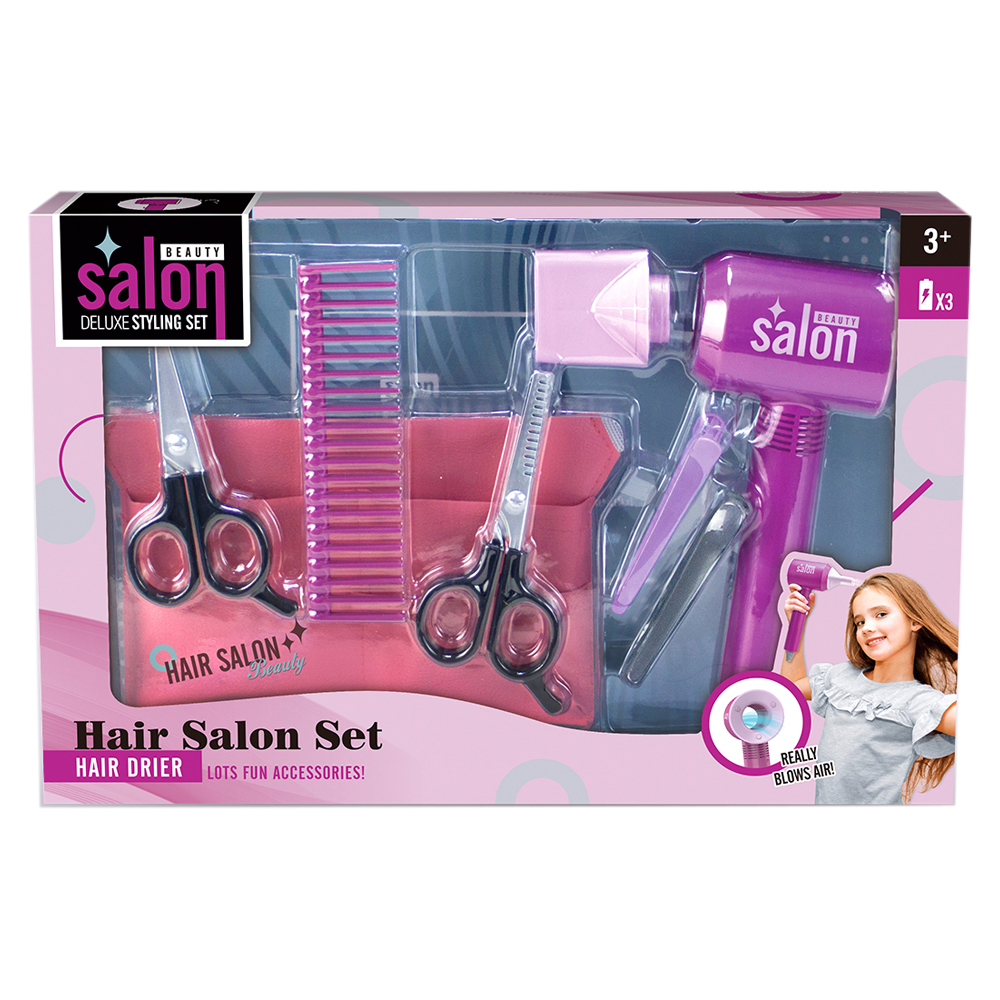 Zestaw fryzjerski składający się z wielu elementów: suszarki, torebki na drobiazgi przyczepianej w pasie, dwóch par nożyczek, grzebienia oraz dwóch spinek. Suszarka wymaga baterii: 3xAAA (niedołączone)
