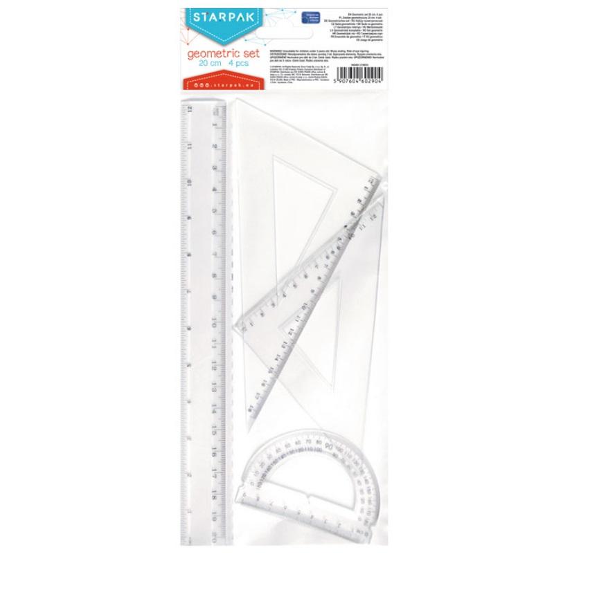 Zestaw geometryczny składający się z linijki, 2 ekierek oraz kątomierza.