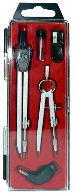 Zestaw cyrkli szkolnych zwierający: składany cyrkiel zwykły i cyrkiel precyzyjny, zapasowy grafit, temperówkę oraz koncówkę do rapidografów. Całość w trwałym plastikowym etui.