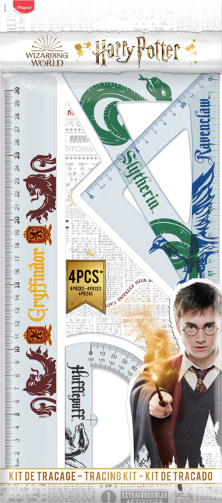 Geometryczny zestaw linijek z kolekcji Harry Potter, w skład którego wchodzą 4 elementy: linijka 30 cm, ekierka 45°/21 cm, ekierka 60°/21 cm, kątomierz 180°/12 cm.