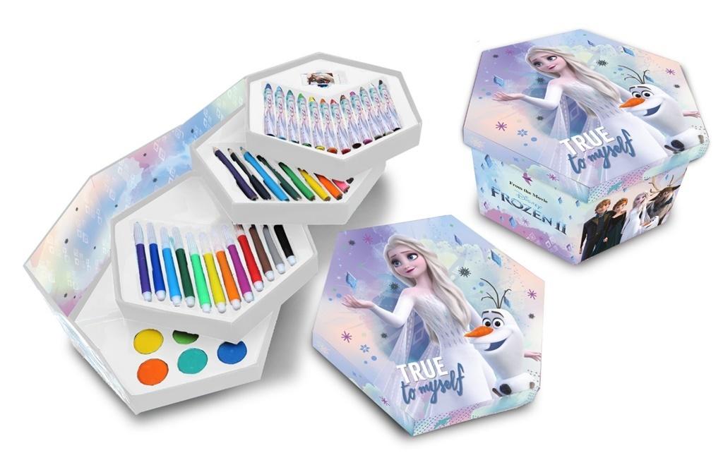 zestaw FROZEN zawiera: gumka do wymazywania: 1szt. kredki woskowe: 12 kolorów temperówka: 1szt. kredki drewniane: 12 kolorów pisaki: 12 kolorów pędzelek: 1szt. Razem 51 elementów farbki akwarelowe: 12 kolorów